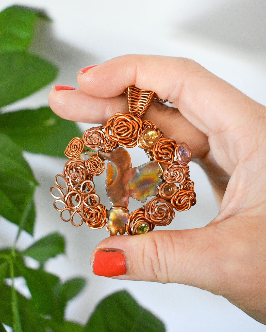 Peridot, amethyst, citrine, with a hand cut and crafted hummingbird wrapped in copper