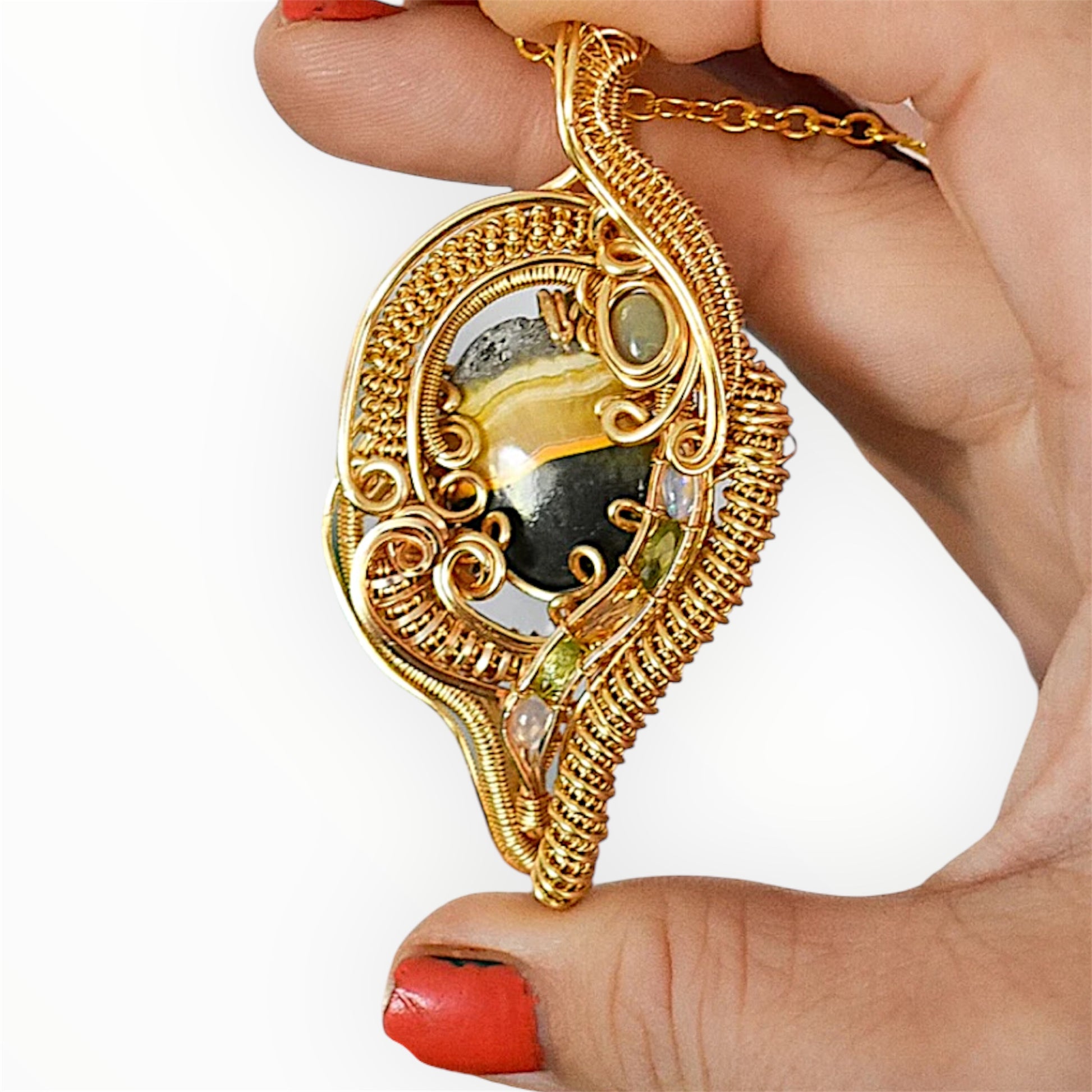 Bumblebee jasper, citrine, peridot & Opal wrapped in a golden weave